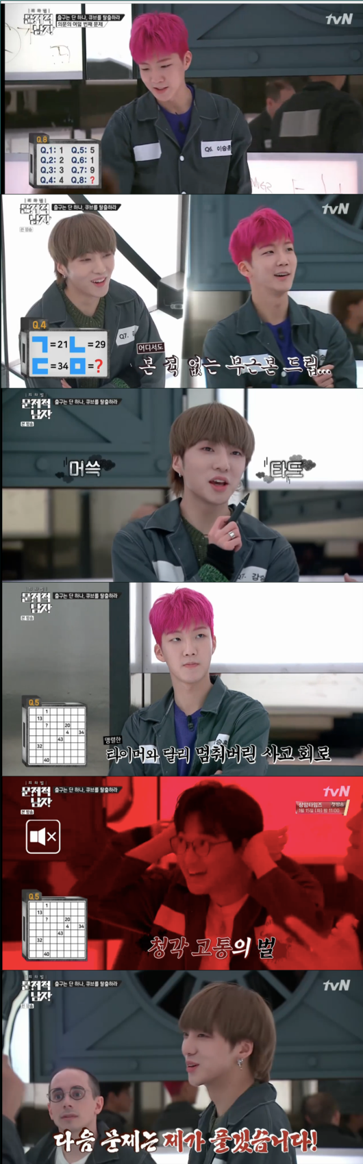 1일 방송된 tvN ‘문제적남자’는 ‘죄와 벌’ 특집으로 꾸며진 가운데 위너 강승윤, 이승훈이 게스트로 출격했다. 이번 신년특집은 영화 ‘큐브’에서 차용, 주어진 문제를 모두 풀어야만 탈출할 수 있는 큐브 세트에서 진행됐다. 이승훈, 강승윤과 멤버들은 제한시간 내 문제를 풀기 위해 고군분투했다.