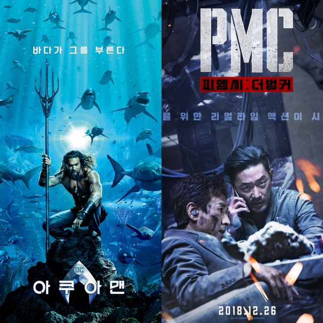영화 ‘아쿠아맨’(감독 제임스 완, 수입배급 워너브러더스 코리아)과 ‘PMC:더 벙커’(감독 김병우, 제공배급 CJ엔터테인먼트, 제작 퍼펙트스톰필름)가 새해 첫 날 나란히 쌍끌이 흥행을 기록했다.