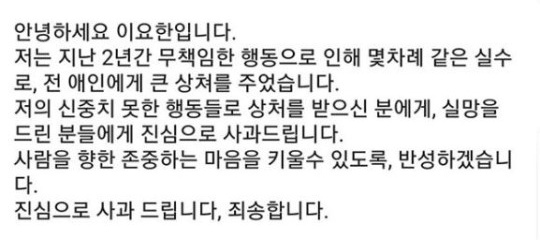 이요한에 대한 폭로글은 인터넷을 통해 빠르게 퍼졌고, 당사자 이요한은 SNS를 통해 “지난 2년간 무책임한 행동으로 인해 몇 차례 같은 실수로 전 애인에게 큰 상처를 줬다. 신중치 못한 행동들로 상처를 받으신 분에게, 실망을 드린 분들에게 진심으로 사과드린다. 사람을 향한 존중하는 마음을 키울 수 있도록 반성하겠다. 진심으로 사과드린다. 죄송하다"며 전 연인과 팬들을 향한 사과의 마음을 드러냈다.