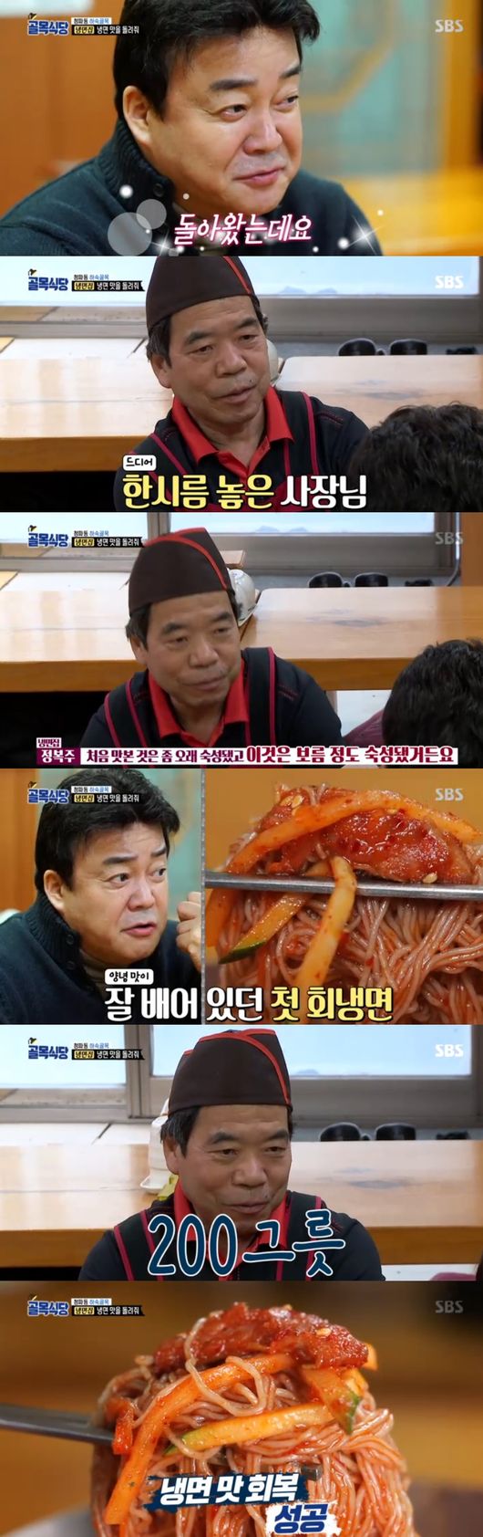 이날 백종원은 43년 전통 숙성 회냉면집을 다시 찾아갔다. 처음 먹었던 그 맛을 돌려달라고 앞서 말했던 터라 냉면집 사장은 더욱 심기일전하며 요리를 시작했다. 백종원은 "냉면맛이 안 돌아왔을지 갈비탕만 팔아야할 것"이라고 말하면서도 숙성회 냉면에 대해 기대감을 안고 시식했다. 미묘한 긴장감이 흐르던 그때, 백종원은 "냉면 맛이 돌아왔다"고 말해 모두를 소름돕게 했다.냉면집 사장은 드디어 한 시름 놓은 듯 눈물을 닦았다. 다시 찾은 43년 세월의 맛이 모두를 뭉클하게 했다.그제서야 냉면집 사장도 미소를 지었다.