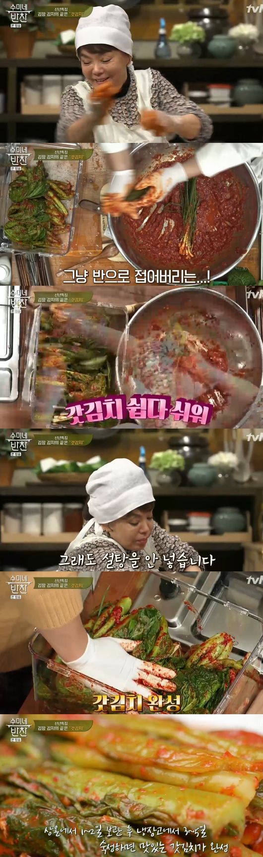 김수미는 "갓김치에는 설탕을 넣으면 안된다. 망친다"고 조언했다.