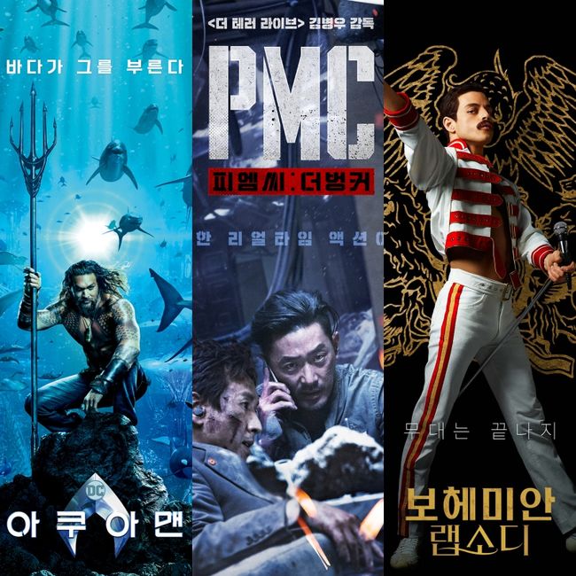영화 ‘아쿠아맨’, ’PMC:더 벙커’가 5일 연속 박스오피스 상위권을 점령하고 있다. 특히 ‘보헤미안 랩소디’의 역주행도 눈길을 끄는 부분이다.