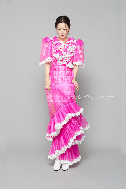 화보 속 홍수아는 청순한 여신미가 돋보이는 사랑스러운 핑크, 화이트 드레스룩과 그와 상반되는 고혹미 넘치는 블랙슈트 룩으로 특유의 인형미모로 과시했다.