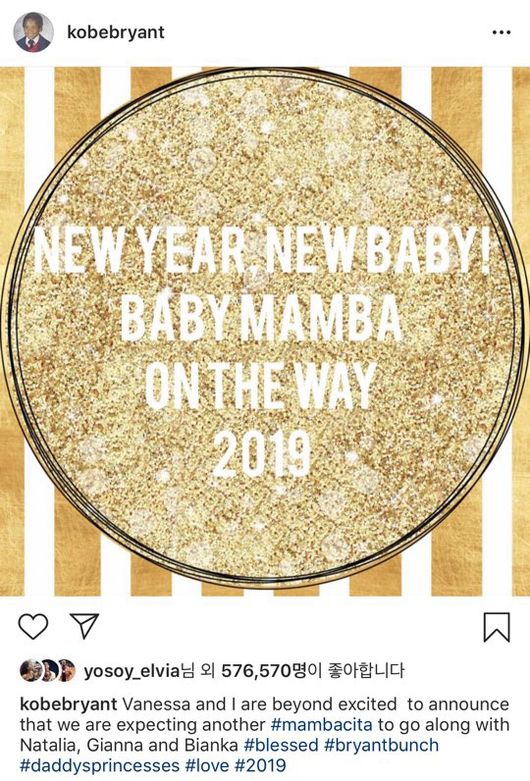 브라이언트는 2일 자신의 SNS 계정을 통해 “새해 새로운 아이가 생겼다. 새 아이가 2019년에 태어난다”라며 아내의 임신사실을 알렸다.