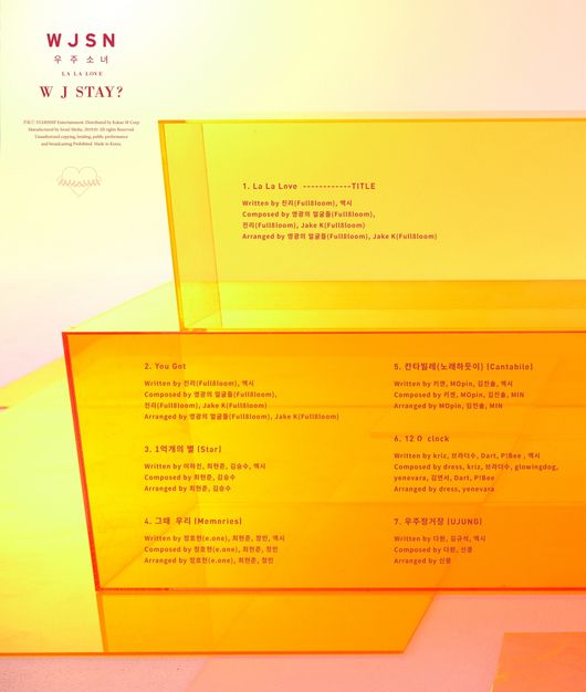 공개된 이미지에서는 맑고 투명한 오렌지빛 배경에 우주소녀의 새 앨범 'WJ STAY?'의 트랙리스트가 적혀있어 눈길을 끈다.