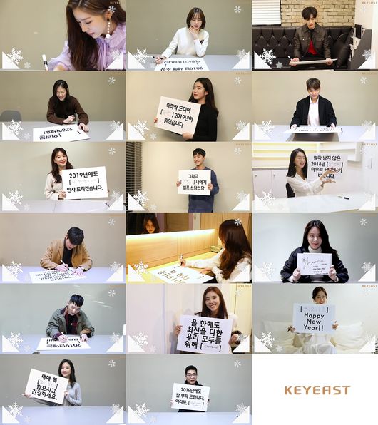 공개된 영상 속에는 키이스트 소속 배우들이 등장, 릴레이 인사말을 완성하기 위해 고민의 고민을 거듭해 빈칸을 채우는 모습이 담겨있다. 각자 자신의 판넬에 자필로 의미와 센스를 더한 문구들을 적으며 팬들을 향한 애정 어린 마음을 전했다.