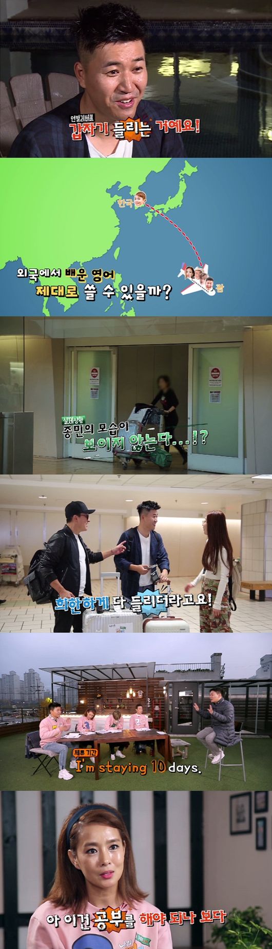 오늘(3일, 목) 방송하는 3회에서는 100시간의 집중 학습 후 실전을 위해 괌으로 떠난 멤버들의 모습이 공개된다. 김종민이 괌의 입국관리소에서 다른 멤버들보다 늦게 나오자 멤버들은 그가 영어로 대화할 수 있었을지 궁금해한다. 이에 김종민은 처음부터 끝까지 자신의 힘으로 괌에 온 이유를 직원에게 영어로 설명해 입국관리소를 통과했다고 밝혀 놀라움을 선사하는 것. 김종민은 "예전에는 입국 심사가 항상 겁이 났다. 그런데 100시간의 학습 후 영어가 들리기 시작했다. 할 수 있겠다는 자신감이 생겼다"고 전해 이날 방송에 더욱 궁금증이 집중된다.
