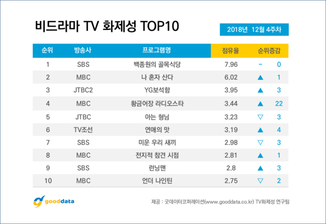그 외 이필모X서수연의 결혼 소식이 전해진 TV조선 ‘연애의 맛’이 6위, 홍진영X홍선영 자매의 먹방이 화제 된 SBS ‘미운 우리 새끼’가 7위, 이영자의 대상 수상 및 광희 매니저의 과거 논란이 발생한 MBC ‘전지적 참견 시점’이 8위, 썸탄클로스 특집이 펼쳐진 SBS ‘런닝맨’이 9위, 방탄소년단이 디렉터로 깜짝 등장한 MBC ‘언더 나인틴’이 10위를 기록했다.