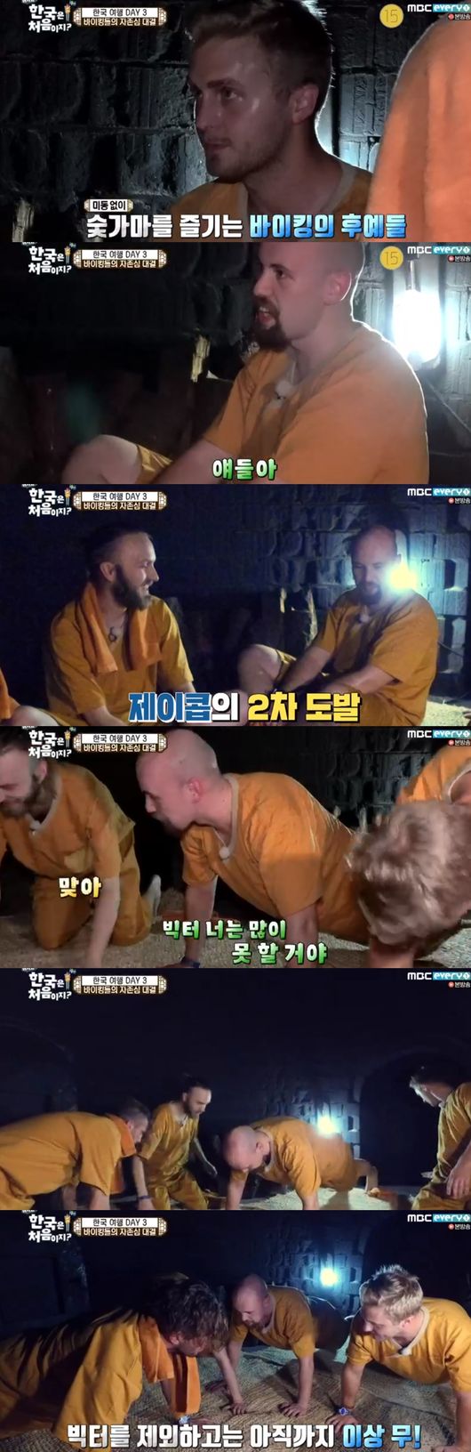 이후 이들은 찜질방 체험에 나섰다. 찜질방에 잘 적응하는 친구들에게 제이콥은 "바이킹이 이 정도로 되겠니? 좀더 더운데로 가자"라고 도발했다. 이후 고온 찜질방에 들어갔다. 제이콥이 더 더워야한다며 푸시업을 하자고 했다. 친구들은 찜질방 안에서 릴레이 푸시업을 하며 자존심을 건 대결을 해 웃음을 자아냈다. rookeroo@osen.co.kr