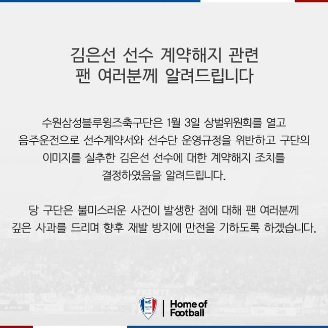 수원은 "음주 운전으로 선수계약서와 선수단 운영규정을 위반하고 구단의 이미지를 실추했기 때문이다"며 "불미스러운 사건이 발생한 점에 대해 팬 여러분께 깊은 사과를 드린다. 향후 재발 방지에 만전을 기하도록 하겠다"고 사과했다.