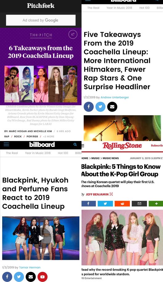 더불어 피치포크는 ‘2019 코첼라 라인업에서 살펴봐야할 여섯 가지’라는 특집 기사를 통해 쟁쟁한 글로벌 스타들인 ‘Childish Gambino, Tame Impala, Ariana Grande, Bad Bunny’와 블랙핑크를 나란히 조명했다. 피치포크는 “엄청난 인기를 자랑하는 블랙핑크가 올해 코첼라에서 공연을 펼칠 최초의 K팝 걸그룹이 될 전망”이라고 블랙핑크의 세계적인 영향력에 주목했다.