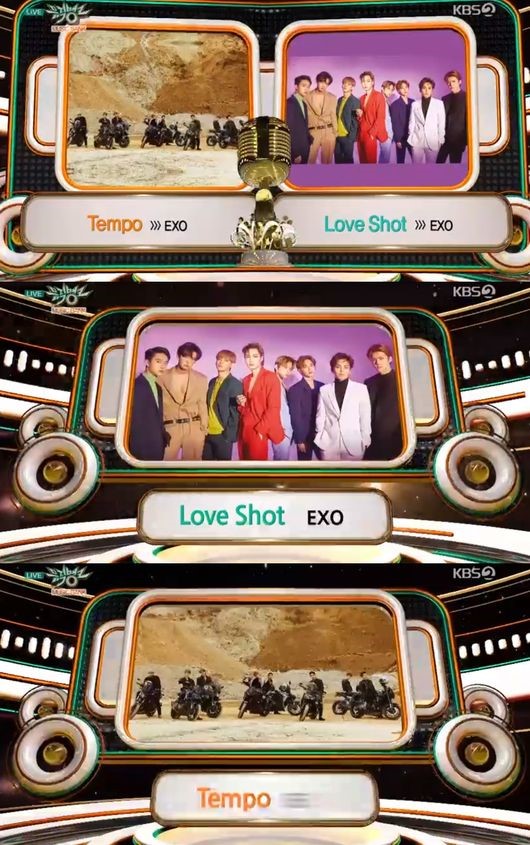 이날 방송에서는 엑소가 '템포(Tempo)'와 '러브 샷(Love Shot)'으로 1위 후보에 올라 엑소와 엑소가 1위를 두고 대결을 펼치는 진풍경이 펼쳐졌다.