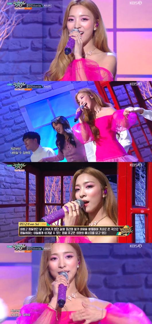 루나는 '운다고'로 9개월 만에 가요계 컴백을 알렸다. 타이틀곡 '운다고'는 그루비한 베이스와 펑키한 기타 연주, 따뜻한 신스 사운드가 어우러진 미디엄 템포의 R&B 팝곡. 루나가 썼던 일기 내용을 바탕으로, 삶에 지친 모든 이들에게 힘을 주고픈 희망의 메시지가 공감을 자아낸다. 특히 루나는 한층 성숙해진 비주얼과 독보적인 가창력으로 '감성 디바'라는 수식어다운 무대를 완성했다.