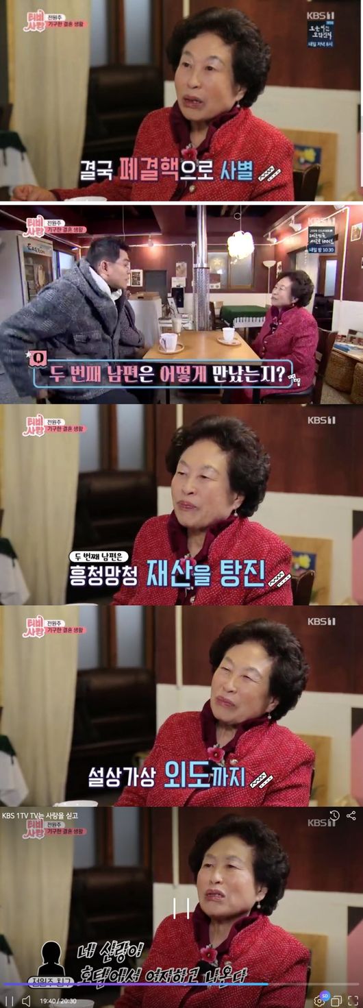 4일 방송된 KBS 1TV ‘TV는 사랑을 싣고’에서 전원주는 28살에 결혼해 가정을 이뤘던 첫 번째 남편에 관해 “너무 무서웠다. 밥상도 갖다 바쳐야 했다. 너무 무서워서 말대꾸도 못했다. 부부싸움도 절대 못했다. 결혼 3년 만에 폐결핵으로 세상을 떠났다”고 털어놨다.