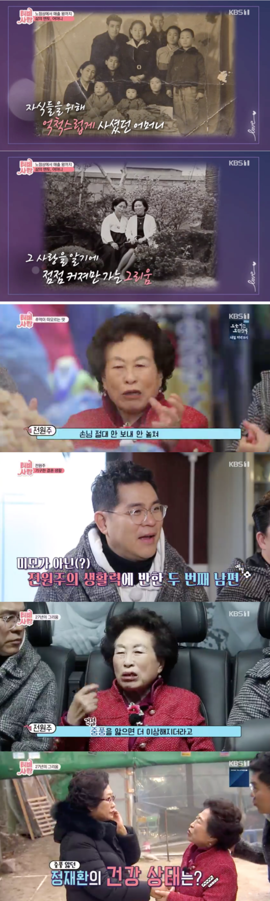 첫 번째 남편을 잃고 어머니의 반대를 무릅쓰고 재혼한 전원주는 중풍으로 어머니와 두 번째 남편을 모두 잃었다. 그는 “제가 1996년에 광고로 성공한 걸 어머니는 못 보셨다. 부모는 자식이 효도할 때를 기다려 주지 않는다는 걸 뼈저리게 느꼈다”며 눈시울을 붉혔다.
