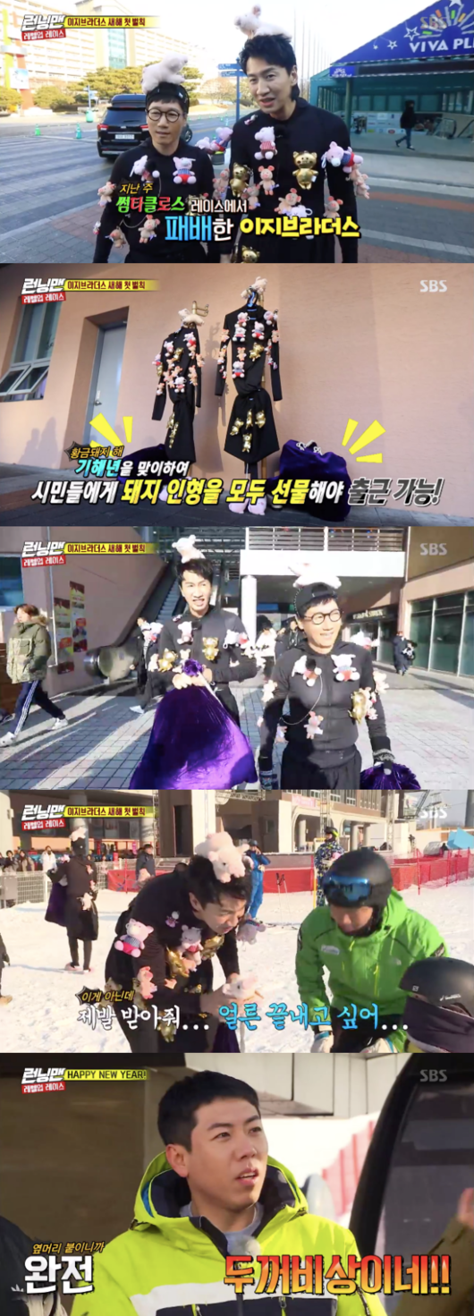 지난 레이스에서 패배해 벌칙을 받고 있었던 것. 지석진과 이광수는 검정색 쫄쫄이 의상에 돼지 인형을 달고 스키장에 모인 사람들에게 돼지 인형을 나눠줘야 했다. 두 사람은 부끄러워하면서도 열심히 시청자들과 만나 인형을 나눠줬다.