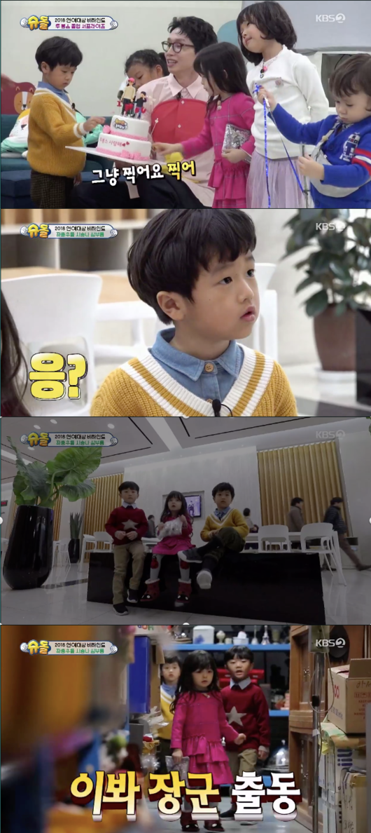 봉태규와 시하를 위한 깜짝 파티를 위해서 아이들은 꽃을 들고 대기실 여기저기 숨었다. 불이 켜지고 ‘슈돌’ 멤버들은 시하에게 꽃을 선물했다. 봉태규와 시하를 위한 깜짝 파티는 성공했다.