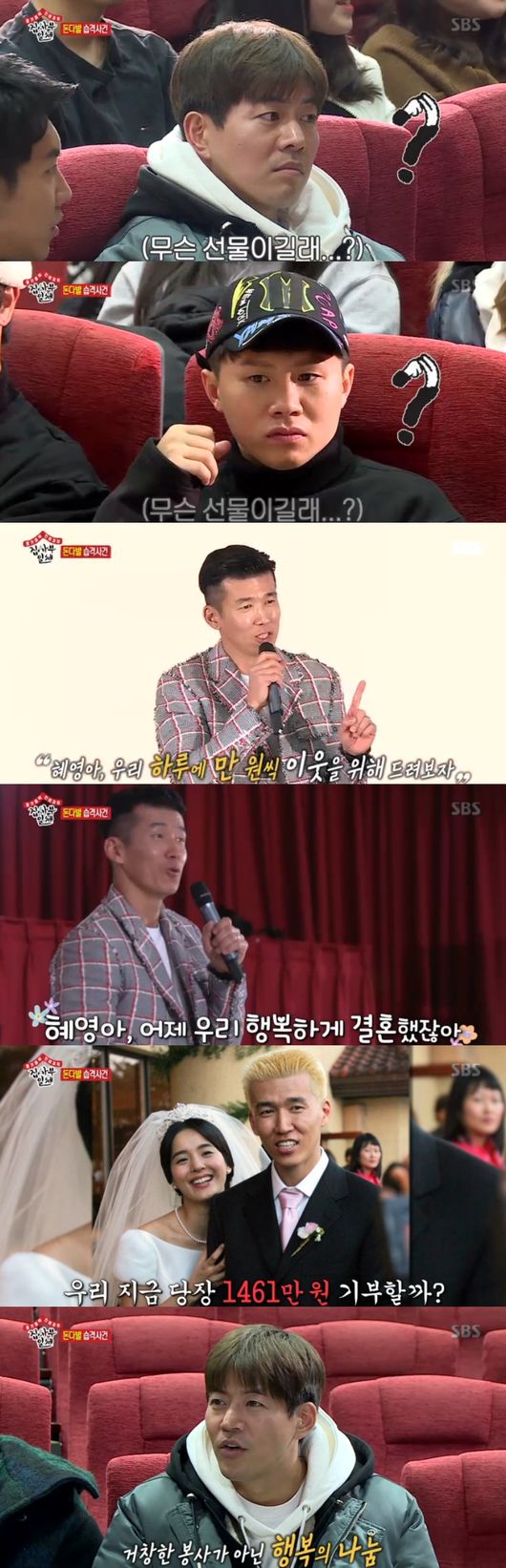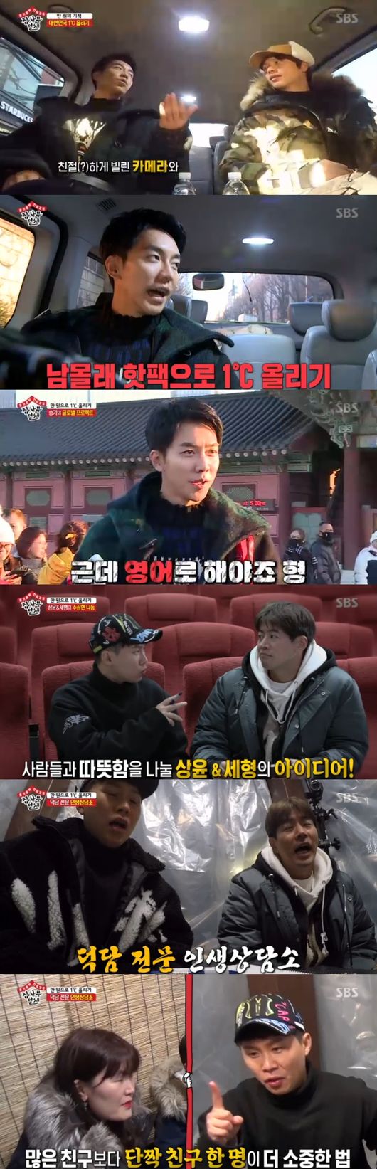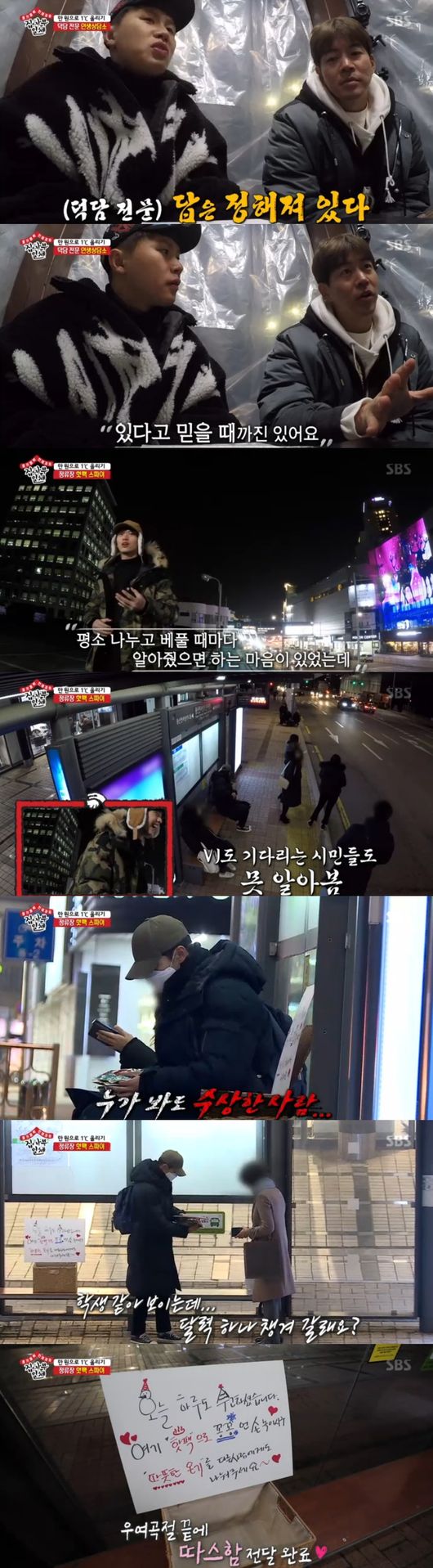 성재는 핫팩 푯말을 만들어, 지나가는 행인들에게 하나씩 전해주기로 했다. 성재는 "평소 나누고 베풀 때마다 알아줬으면 하는 마음이 없다면 거짓말, 하지만 오늘 만큼은 익명으로 나눠드리니 더 따스함을 느낀다"면서 스스로 자신에게 감탄하는 사이, 누군가 등장했다. 알고봤더니 승기가 바람잡이로 등장한 것.