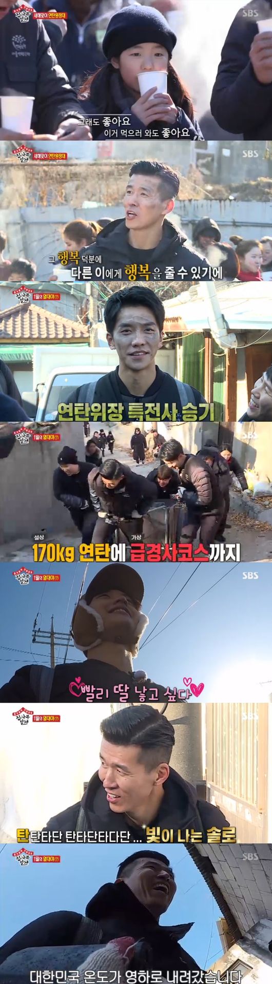연탄은 3천장이 준비되어 있었다. 한 명씩 6백장이 맡아진 상황. 션은 "우리의 땀으로 대한민국 온도를 올리지, 온도1도 올리기"라고 외치며 봉사에도 코스가 있다고 했다. 난이도 상중하 높이에 따라 연탄 배송요금이 추가되지만 우리가 직접 나르면 배송비를 절약할 수 있다고 전했다.