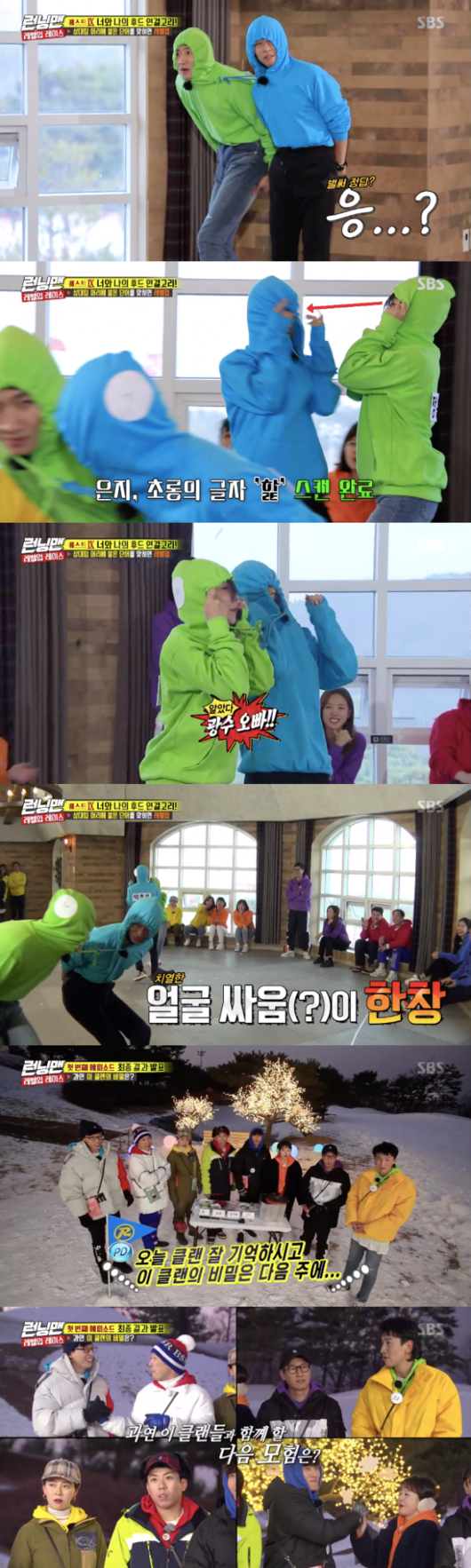 에이핑크 멤버들과 함꼐 하는 커플 레이스에서 맞붙게 된 유재석과 이광수였다. 두 사람은 후드티셔츠의 끈을 묵어 얼굴을 맞댄 후 서로의 머리에 붙여진 글자를 맞혀야 했다. 게임이 시작되면서 두 사람은 치열한 싸움 대신 조심스럽게 옆으로 머리를 맞대고 섰다.