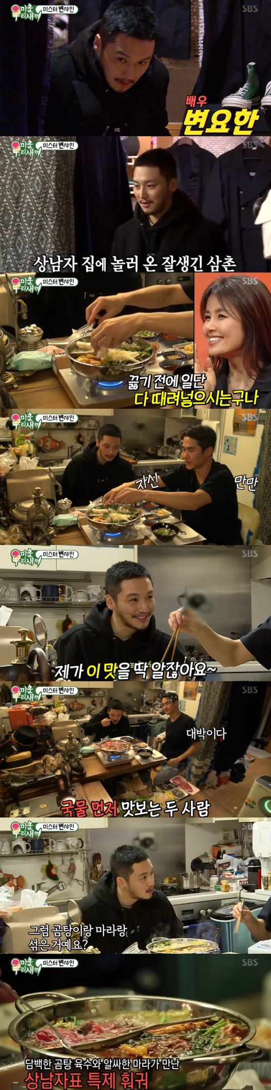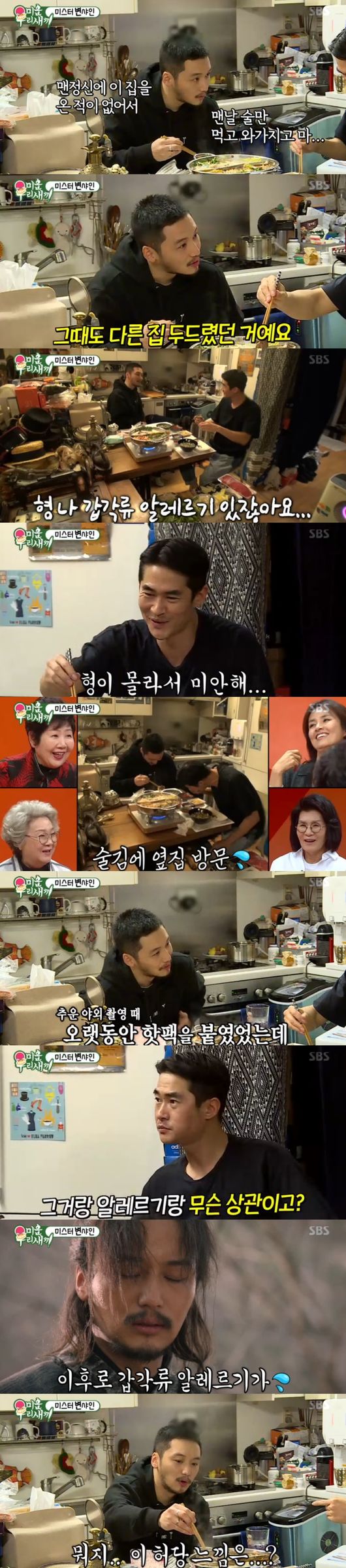 변요한은 "저번에 누룽지 먹던데 왜 이렇게 비싼걸 준비했냐"면서 고마워했다. 특별히 준비한 전복과 새우, 변요한은 "갑각류 알레르기 있다"면서 당황했다. 무사역할로 촬영할 때 핫팩을 붙이고 난 뒤 알레르기가 생겼다고. 배정남은 "그게 무슨 상관이 있냐"면서 허당느낌의 변요한 발언에 웃음이 터졌다.