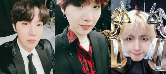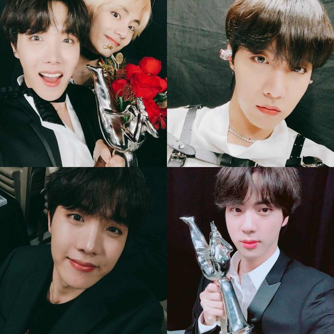 방탄소년단은 트로피를 들고 찍은 셀피를 공개하며 기쁨을 나누고 있다. 멤버들은 각자의 방식으로 인증샷을 찍으며 즐거워하고 있다.