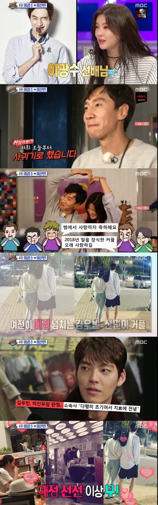 이에 맞서 이광수와 이선빈 커플도 언급됐다. 이상형에서 연인으로 공식커플로 발전, 5개월째 열애중이라고 밝혀 많은 축하를 받고 있다. 이와 더불어 4년째 연애 중인 김우빈과 신민이아 커플의 호주데이트 모습 공개되어 화제가 됐다. 오랜만에 공개된 근황사진에서 다정하게 팔짱을 껴고 거는 모습이 그려져, 애정전선에 대해 이상이 없음을 전했다. 투병 속에서도 사랑을 유지하는 두 사람을 모두가 응원했다.