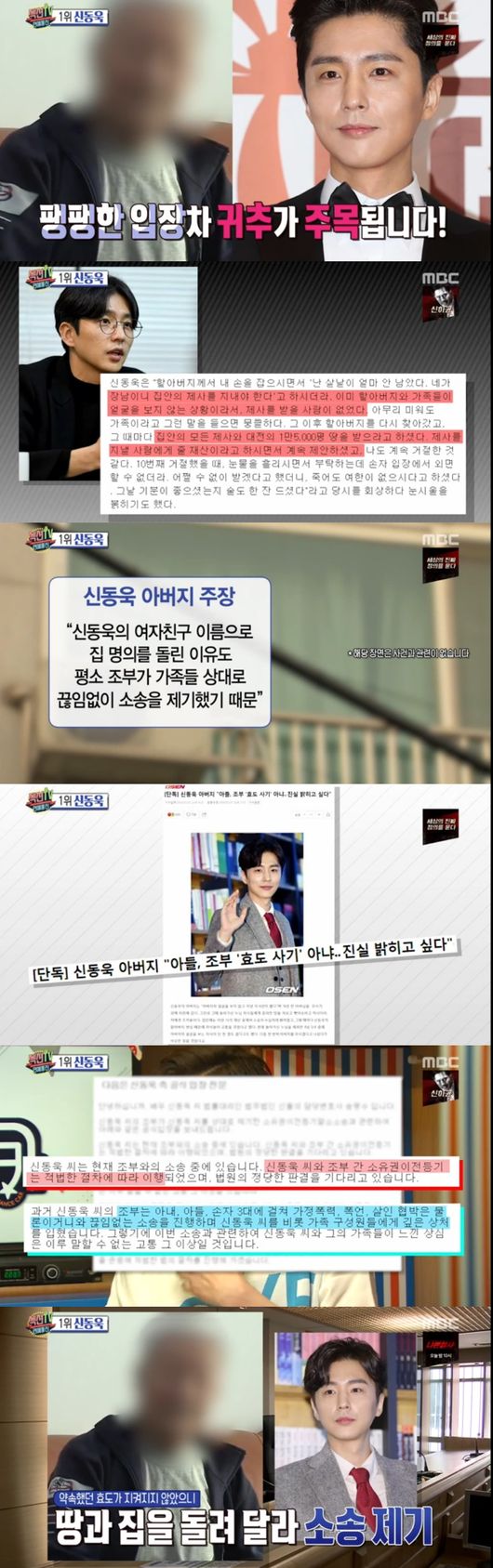 1위는 신동욱이 친할아버지와 효도사기 공방에 벌어진 사건을 전했다. 96세 조부가, 임종까지 돌봐달라 효도계약을 했으나 본인을 속여 토지를 모두 가져갔다고 고소한 것. 2시간여 만에 신동욱 측은 허위사실이며 소유권 이전은 적밥한 절차에 이행되었다고 했다. 신동욱 아버지도 직접 진화에 나서 현재 가족들도 연락을 끊은 상태라고 전했다. 신동욱은 "가족과 왕래조차 없는 할아버지를 외면할 수 없어 손자로서 살뜰히 챙겼다, 하지만 드라마 촬영차 바빠 열흘 동안 챙기지 못한 것에 대해 문제삼은 것"이라며 어두웠던 가정사를 공개, 법정공방에 관심이 집중되고 있으며, 팽팽한 입장차이에 대한 귀추가 주목된다.