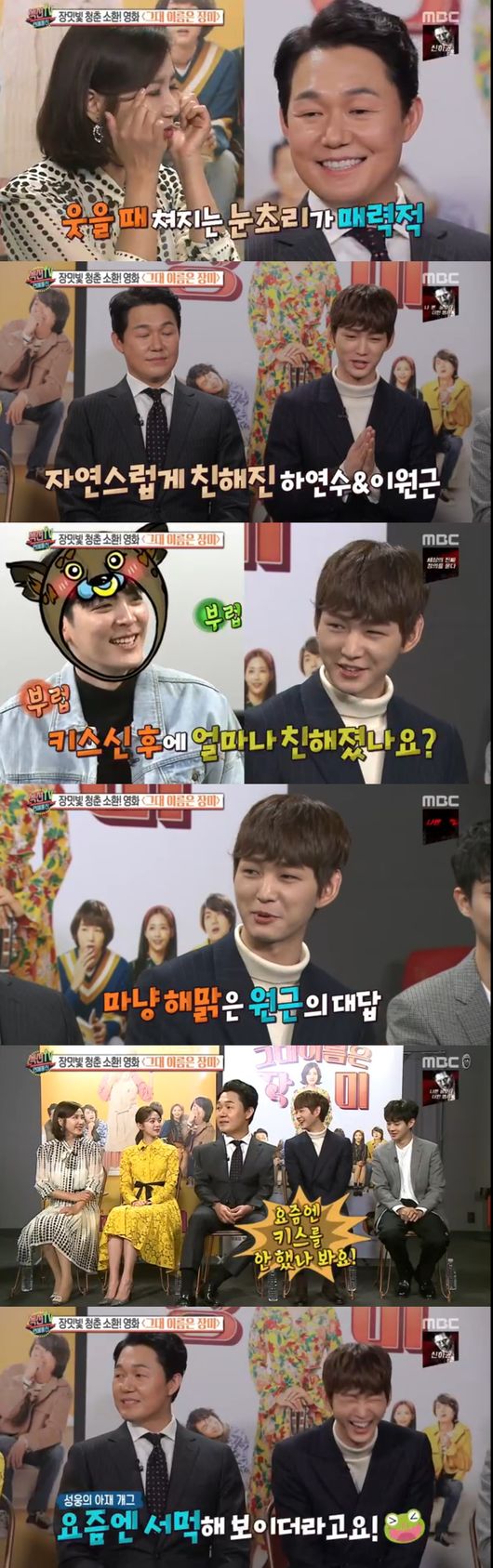 장빗빛 청춘을 소환할 영화 '그대 이름은 장미'로 모인 배우들이 그려졌다. 유호정부터 채수빈, 박성웅, 이원근, 최우식이 자리에 모였다. 19070년대로 타임슬립한 이원근은 하연수와의 케미에 대해 묻자, "키스신 이후 자연스럽게 친해졌다"면서 "물이라도 더 챙겨주게 됐다"고 해 웃음을 안겼다. 유호정은 "맛있는 거라도 사주지, 물이 뭐냐"고 말하자, 옆에서 박성웅은 "요즘엔 키스를 안했나보더라, 또 서먹하더라"고 받아쳐 웃음을 안겼다.