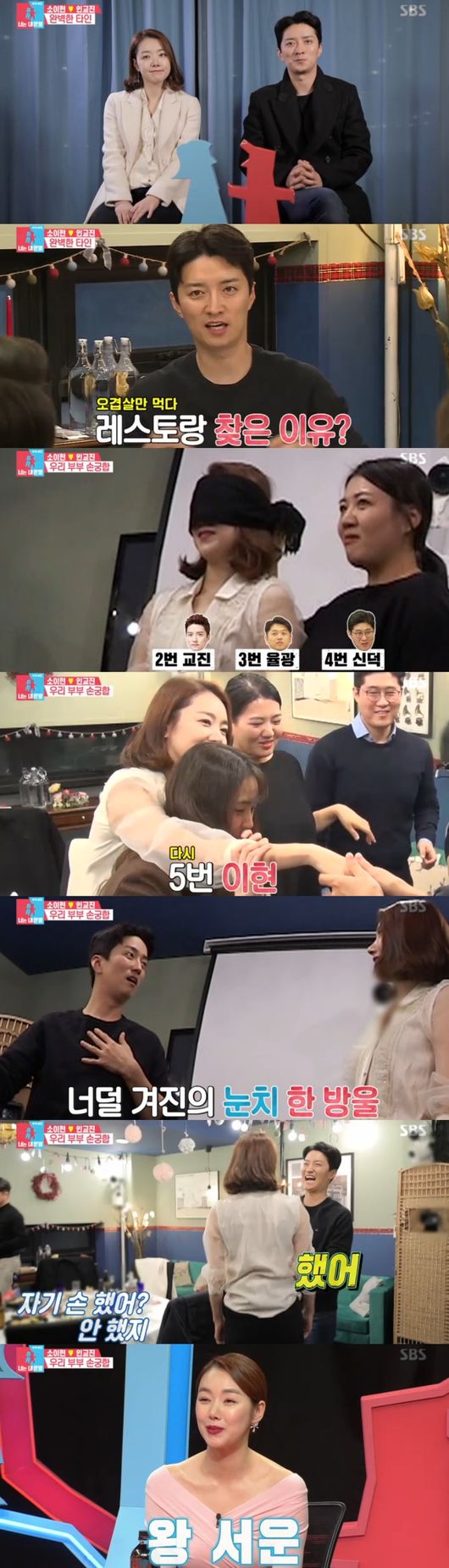 고난도 게임인 만큼 모두 맞혀내지 못해 배꼽을 잡게 했다. 이때 소이현 순서가 됐다. 소이현은 "재작년엔 실패했다"며 불안, 이번엔 성공할지 기대감을 안긴 가운데 교진의 손을 맞혔다. 두 사람은 서로를 부둥켜 안으며 기뻐했다. 다음은 인교진이 눈을 가리고 아내 소이현 손을 찾기로 했다. 하지만 작년에 이어 이번에도 실패한 것. 소이현은 "3년 연속 못 맞혀"라며 서운해했고, 교진은 눈치를 살피며 허그로 민망함을 대신했다. 위기의 순간에 맹구흉내로 웃음보를 터트렸다. 마지막 이구동성 게임을 시작했다. 첫 스킨십부터 첫키스 장소까지 두 사람은 맞혔다. 하지만 좋아하는 취향에 대한 이구동성은 계속해서 멀어져 웃음을 안겼다.
