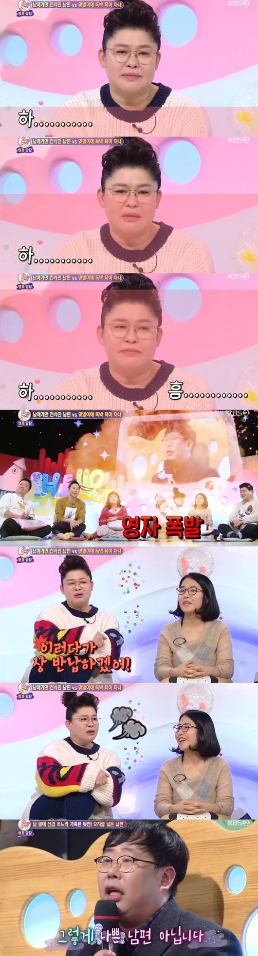 남편이 집안 일을 전혀 도와주고 있지 않았다. 아내는 "큰 애는 어린이집에 맡기고 둘째를 업고 저녁까지 장사를 하고 온다. 독박육아, 살림 다 제가 한다. 분리수거 등 안 해준다. 남편이 TV 좋아해서 오디션 프로그램 보면서도 울면서 그러는데 저는 정말 먹고살기가 너무 힘들다"라고 털어놨다.