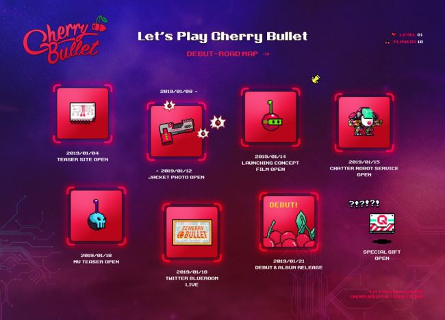‘체리블렛 데뷔 로드맵’이라는 제목의 이미지는 게임 아이템 창고를 떠오르게 하는 아기자기한 아이콘으로 눈길을 끈다. 체리블렛은 이 이미지뿐만 아니라 티저사이트부터 재킷사진까지 모든 콘텐츠에서 마치 하나의 게임을 하고 있는 듯한 독특한 비주얼을 선보이며 데뷔 콘셉트에 대한 궁금증을 자아내고 있다.