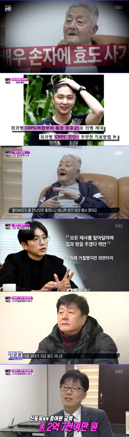 이미 그는 자신의 자식들과 재산 문제로 틀어진 상황. 그래서 배우로 활동하고 있는 손자 신동욱을 불렀다는 그는 “내가 옆에 집까지 사주고 이 집도 주겠다고 했다. 나 좀 돌봐 달라고 했다. 내 앞날을 도와주겠다고 하니 얼마나 반갑나. 대전에 있는 땅 2500평도 주겠다고 했다”고 설명했다.