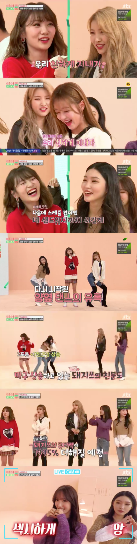 한우를 걸고 본격적으로 95돼지쓰 멤버들의 개별 매력 발산 타임이 시작됐다. ‘댄스 돼지’ 순서에선 유아가 고기세트를 들고 ‘하바나’에 맞춰 코믹한 듯 섹시한 춤을 춰서 박수를 받았다. S라인을 뽐내는 엉덩이 밀치기 게임에선 키가 작은 안지영이 뜻밖의 활약으로 고기를 따냈다.