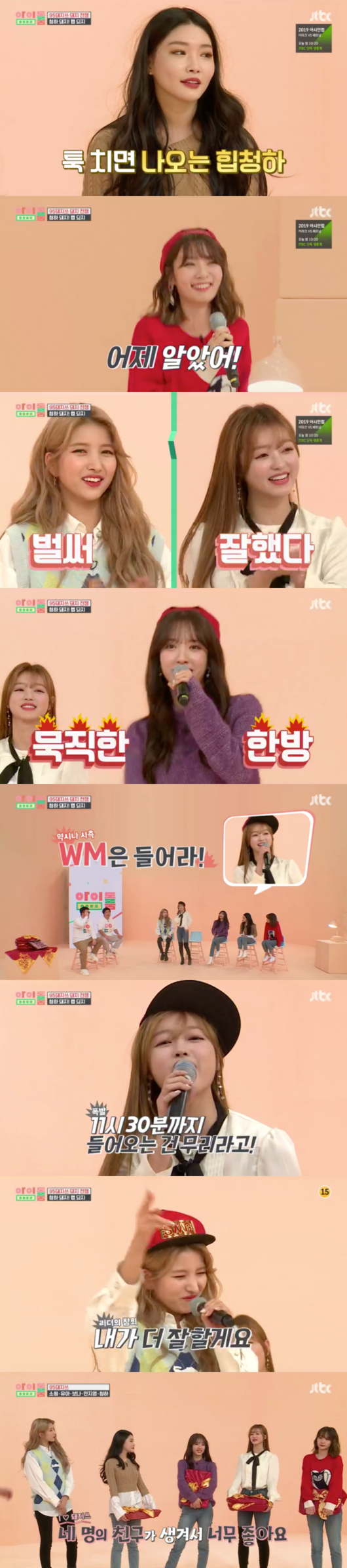 이 말에 다음 순서인 보나는 “난 여행도 안 갔는데 왜 스케줄을 어제 들었냐”며 소속사 스타쉽을 디스해 보는 이들을 배꼽잡게 했다. 그의 뒤를 이어 유아 역시 통금을 만든 회사에 울분을 토했고 소원은 스케줄을 미리 알았지만 활약하지 못했다며 소속사에 사과의 뜻을 전해 웃음을 자아냈다.