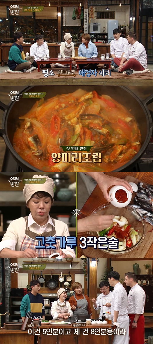 9일 저녁 8시10분 방송되는 tvN 예능 '수미네 반찬' 32회에서는 겨울철 별미로 손꼽히는 양미리를 넣어 조린 양미리조림을 공개한다. 부드러운 알과 쫀득한 살의 상반된 식감이 매력적인 양미리조림은 간단한 조리법으로 비린내를 잡아 놀라움을 안겼다는 후문. 또한 김수미는 육식파와 해산물파도 모두 만족시키는 오삼 불고기와 새콤한 골뱅이무침, 아삭한 오이고추된장무침을 선보인다.게