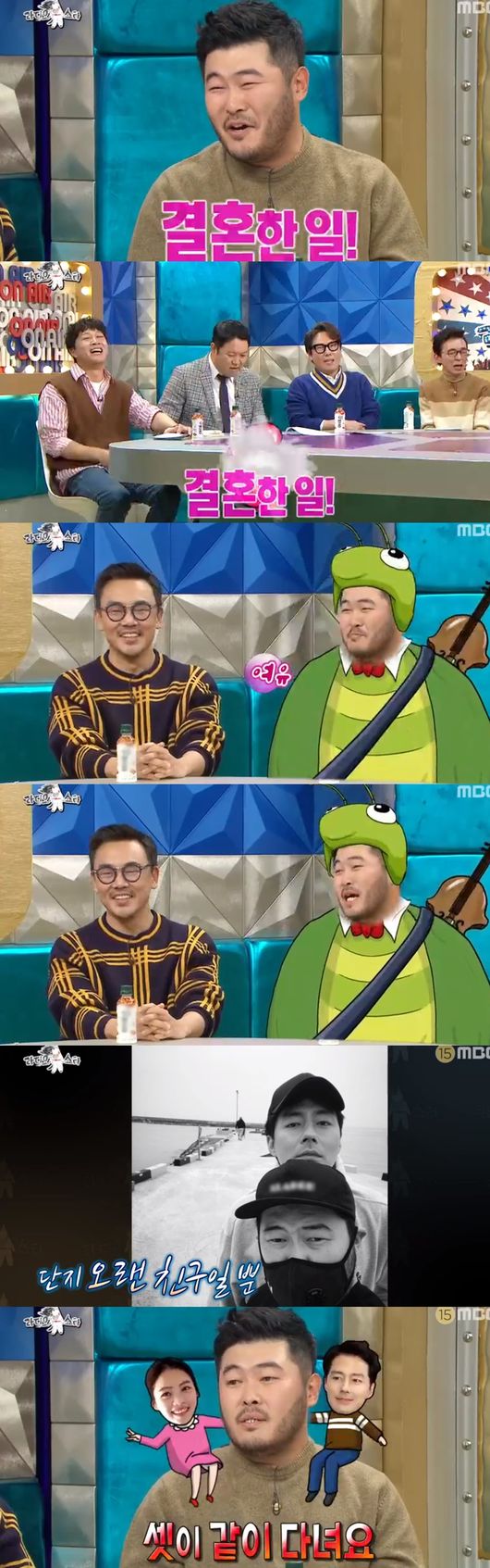 김기방은 "조인성과 아내 셋이 같이 다닌다. 인성이가 여동생이나 시어머니 생긴 것 같다고. 와이프가 인성의 연애 상담을 해주면 깐깐하게 코칭을 해준다"라고 말했다. /rookeroo@osen.co.kr