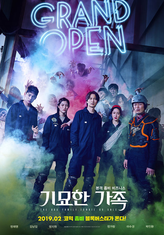 두 번째 포스터는 형형색색의 연무를 뚫고 나오는 좀비 떼가 금방이라도 누군가를 물 것처럼 위협적이지만, 좀비 따위는 신경도 쓰지 않는다는 듯 위풍당당하게 서있는 다섯 배우들의 모습과 대조되며 역대급 코믹 시너지에 대한 기대감을 고조시킨다. 각자의 개성에 맞게 변화를 준 단체복을 맞춰입고 비장하게 정면을 응시하는 가족들 위로 번쩍이는 네온 사인 문구 ‘GRAND OPEN’을 통해 누구 한 명 평범하지 않은 ‘기묘한 가족’의 기상천외한 좀비 비즈니스의 본격적인 시작을 예고하고 있다.