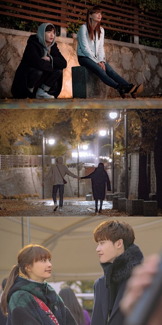 담벼락 아래 나란히 앉은 강단이와 차은호. 말없이 같은 곳을 바라보는 두 사람 사이에 흐르는 편안한 공기가 이들의 관계성을 고스란히 전달한다. 이어진 사진 속 손을 잡고 걸어가는 두 사람의 그림 같은 뒷모습은 바라만 봐도 심장 간질간질한 설렘을 유발한다.