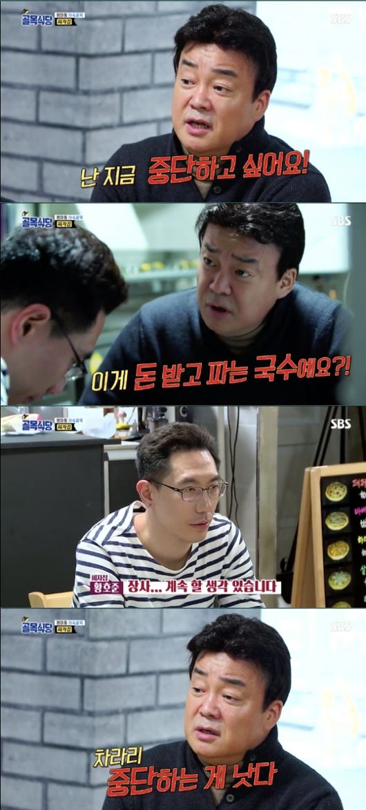 백종원은 "방법이 생각 안난다. 장사를 향한 의지나 절박함이 보이지 않는다. 이 상황에 억지로 솔루션을 진행해봤자 서로 불행해질 뿐이다. 차라리 중단하는게 낫다"면서 "난 지금 중단하고 싶다. 음식 먹어봐야 소용도 없다"고 털어놨다.