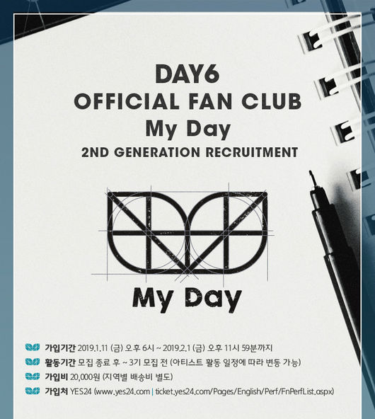JYP엔터테인먼트는 지난달 25일 공식 팬클럽 'My Day' 2기 모집 티저 이미지를 공개한 데 이어 10일 오후 6시 7분 DAY6의 각종 SNS 채널에 5명 멤버 전원이 직접 인사를 전하며 팬클럽 모집을 안내하는 영상을 공개해 이목을 모았다.