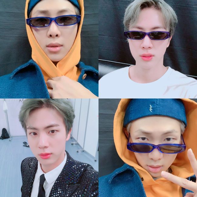 지민 역시 RM과 같은 선글라스를 쓰고 진지한 표정으로 카메라를 바라보고 있는 모습. 진은 반듯한 미모가 잘 나오는 셀피를 공개해 팬들의 시선을 사로잡았다.