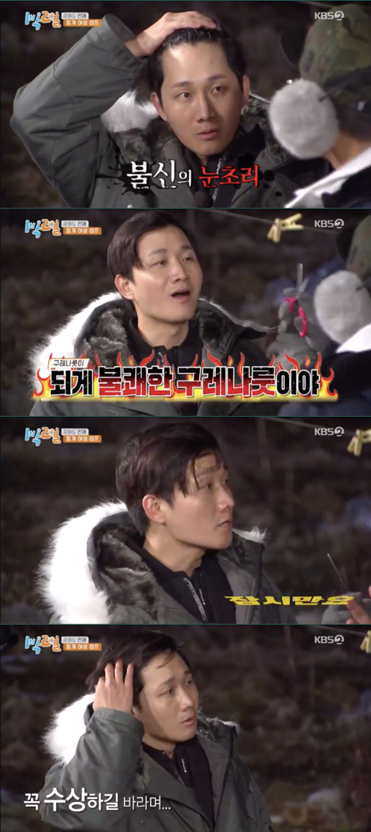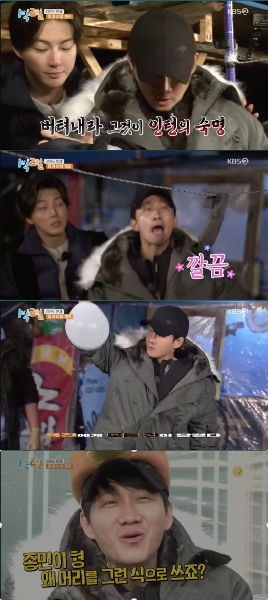 지난 13일 오후 방송된 KBS 2TV ‘1박2일’에서 멤버들은 강원도 인제에서 동계야생캠프를 마쳤다. 홀로 야외취침하는 김종민을 위한 인디언 텐트를 짓고 저녁 복불복을 통해서 맛있는 밥을 먹었다.