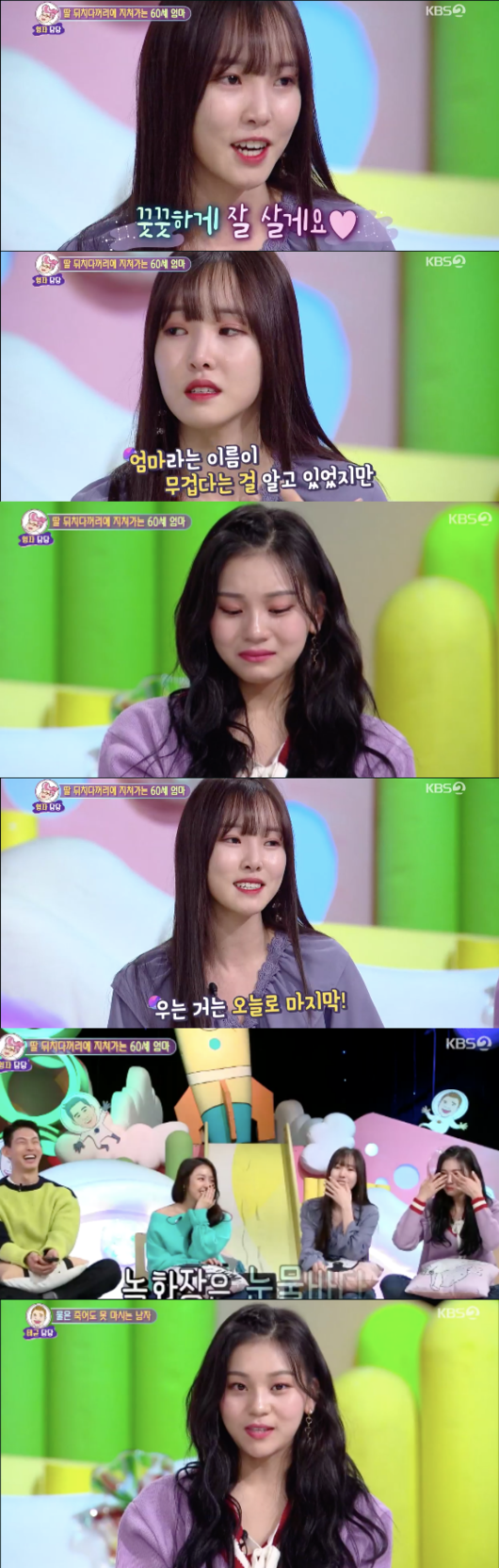 특히 여자친구 유주는 사연을 듣고 눈물을 흘렸다. 그는 “두 분이 행복하셨으면 좋겠다”라며 “우리 엄마가 방송에서 우는 것을 싫어한다. 우는 것은 오늘이 마지막이다. 꿋꿋하게 잘 살겠다”라고 말했다. 이어 엄지도 눈물을 흘리며 말을 잇지 못했다.