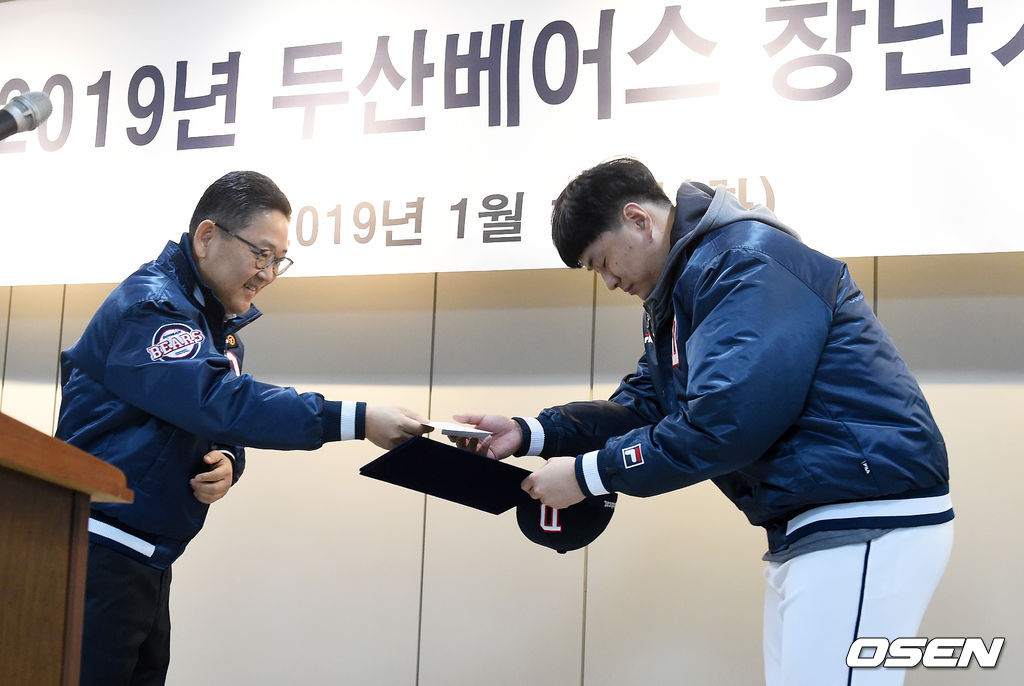 두산 구단도 선수단의 '특별 포상금'을 지급했다. 상장과 함께 상금 1000만원을 수여하며 이영하의 선행을 치하했다. / bellstop@osen.co.kr
