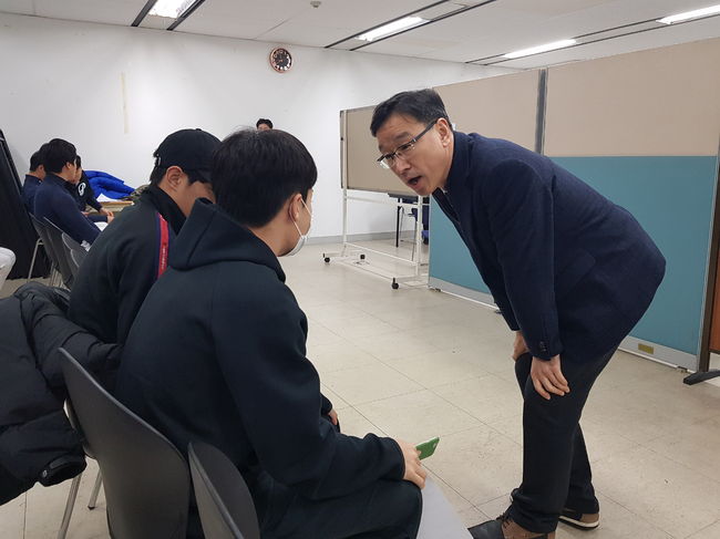 [사진]'재활 무료 클리닉' 현장을 찾은 위성곤 의원(오른쪽)이 부상 진료를 위해 대기 중인 선수들과 이야기를 나누고 있다. /제공=대한선수트레이너협회