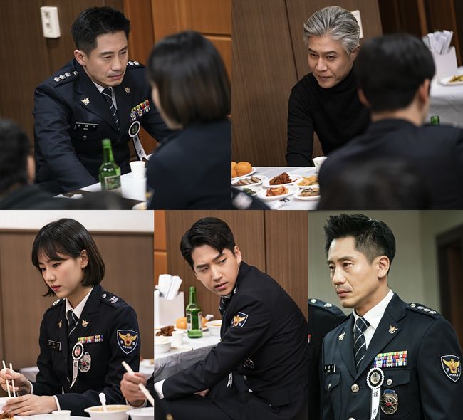 이번에 공개된 스틸은 장례식장에 모여 함께 동료를 잃은 슬픔을 나누고 있는 신하균과 차선우, 이문기, 배유람과 배다빈까지 S&S팀과 이들과 한 장소에서 포착된 박호산의 모습이 담겨있어 시선을 단 번에 사로잡는다. 경찰 제복을 완벽히 갖춰 입고 남다른 포스를 뿜어내고 있는 신하균과 S&S팀은 침통한 분위기 속에서 함께 위로를 나누고 있어 여전히 흔들림 없는 의리가 느껴지는 것은 물론, 보는 이들마저 든든한 마음이 들게 해 눈길을 끈다. 반면 S&S팀과는 다른 테이블에 앉아있는 박호산은 특유의 여유가 느껴지는 표정과 함께 야비함과 야욕이 엿보이는 눈빛을 발산하고 있어 긴장감을 자아낸다.