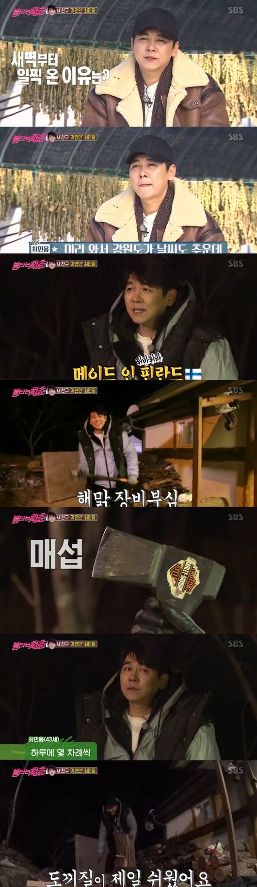 최민용은 "핀란드산 도끼, 날을 직접 갈고 왔다"면서 대장간을 찾아 도끼날을 갈아왔다고 해 놀라움을 안겼다. 장비부심 넘치는 모습으로 해맑게 웃으면서 서슴없이 한 방에 장작을 박살내 시선을 사로 잡았다. 그는 "손에 감기는 맛이 있다"면서 원샷 원킬로 장작달인 모습을 보였다. 최민용은 "산에 2년 살았다"면서 "운동 삼아가 아니라 살기위해 장작패기를 하루에 거르면 안 됐다, 안 그러면 겨울에 추워서 고생한다"고 말하며 수준급 도끼질을 보였다. 이어 "도끼질 하니까 사는 것 같다, 집중해야한다"면서 장작패기를 멈추지 않았다.