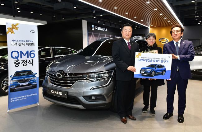 르노삼성자동차(대표이사 도미닉시뇨라)는 15일 서울 강남대로대리점에서 컨슈머인사이트 ‘서비스 만족도’ 3년 연속 1위 달성을 기념해 진행한 오토솔루션 감사 이벤트의 1등 당첨자에게 QM6 가솔린 모델을 증정했다.
