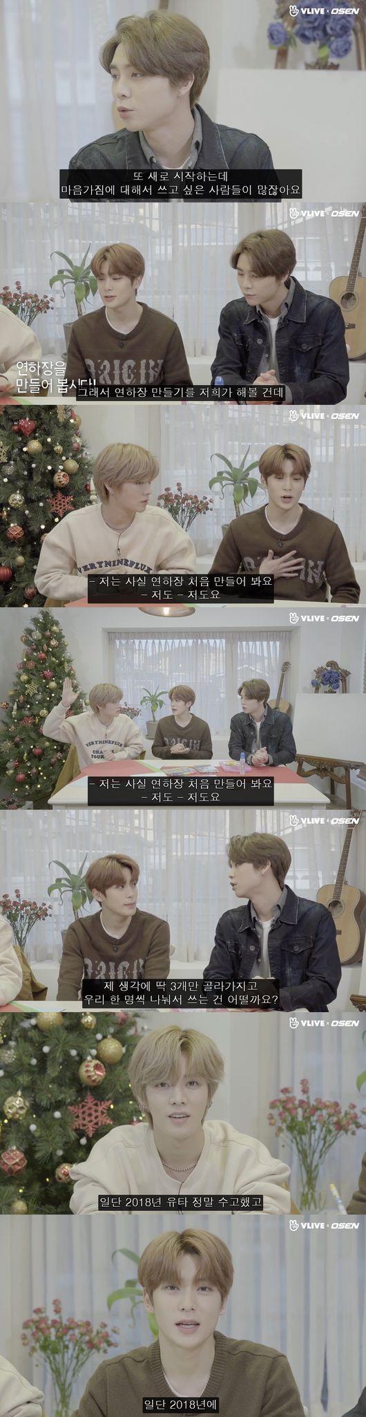 마지막으로 '나에게 편지쓰기'를 하자고 제안했다. 올해 자신에게 하고 싶은 말에 대해 유타는 "2018년 정말 수고했고 진짜 많은 일 있었다, 일본에서 데뷔하고 미국에서도 성공했다"면서 "2019년은 좀더 어린 생각이 아닌 성숙한 생각을 좀 더 전달하고 어른스러운 행동하는 남자가 되길바란다, 더 많이 준비하는거 있으니 열심히 해서 좋은 사람됐으면 좋겠다 파이팅"이라며 자신에게 편지를 보냈다. 재현은 "스물두살 보람차고 알차게 보낸 것 같아 뿌듯하다, 2019년엔 더 성숙해지고 더 큰 멋진 사람이 되길 바란다"면서 "감사함 잊지 말고 행복하게 파이팅 할 것"이라면서 2019년도를 펼칠 스스로에게 응원을 전하며 연하장을 마무리했다.